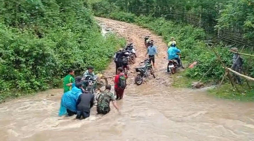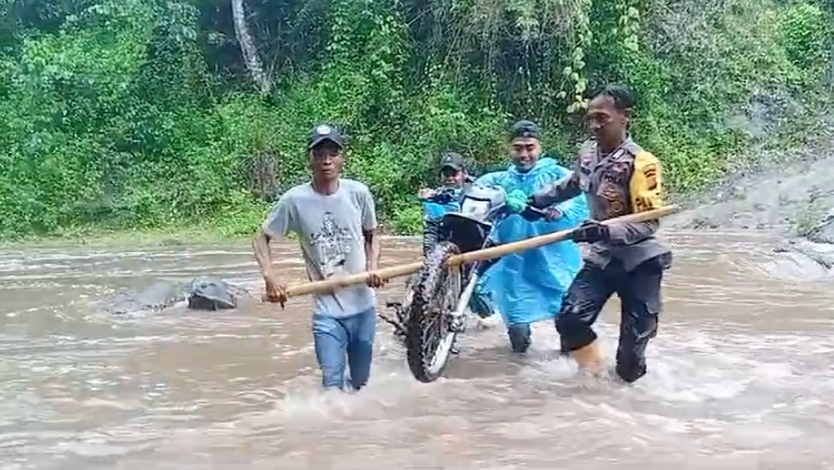 Selain itu, saat akan melintas di aliran sungai petugas harus bersama-sama mengangkat kendaraan menuju seberang dikarenakan volume aliran air sungai yang tinggi dan deras akibat hujan.