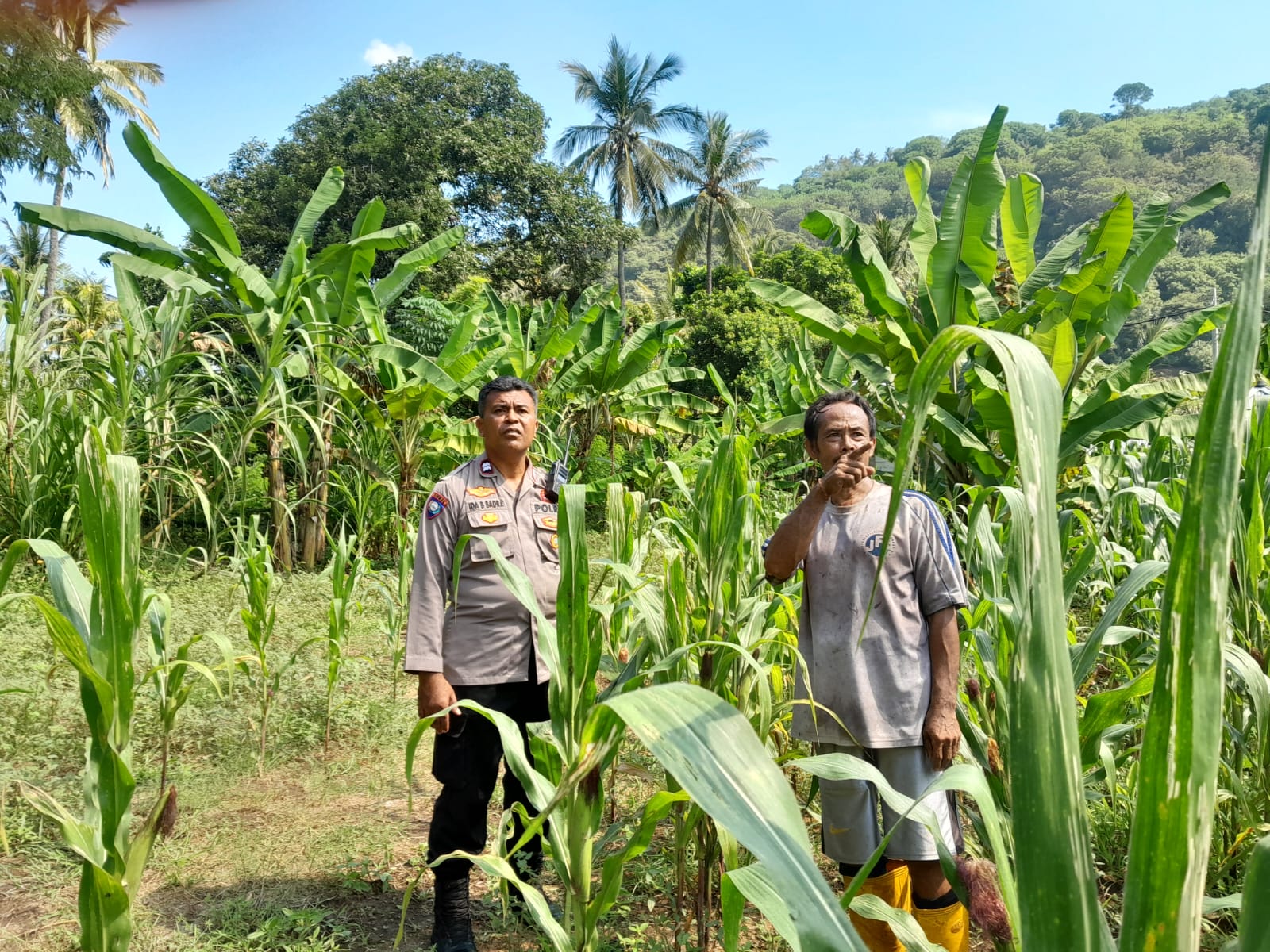 Bhabinkamtibmas Desa Senggigi menyambangi kediaman Ketut Wenten, seorang warga Dusun Krandangan yang sukses memanfaatkan lahannya untuk menanam jagung, Rabu (21/5/2025).