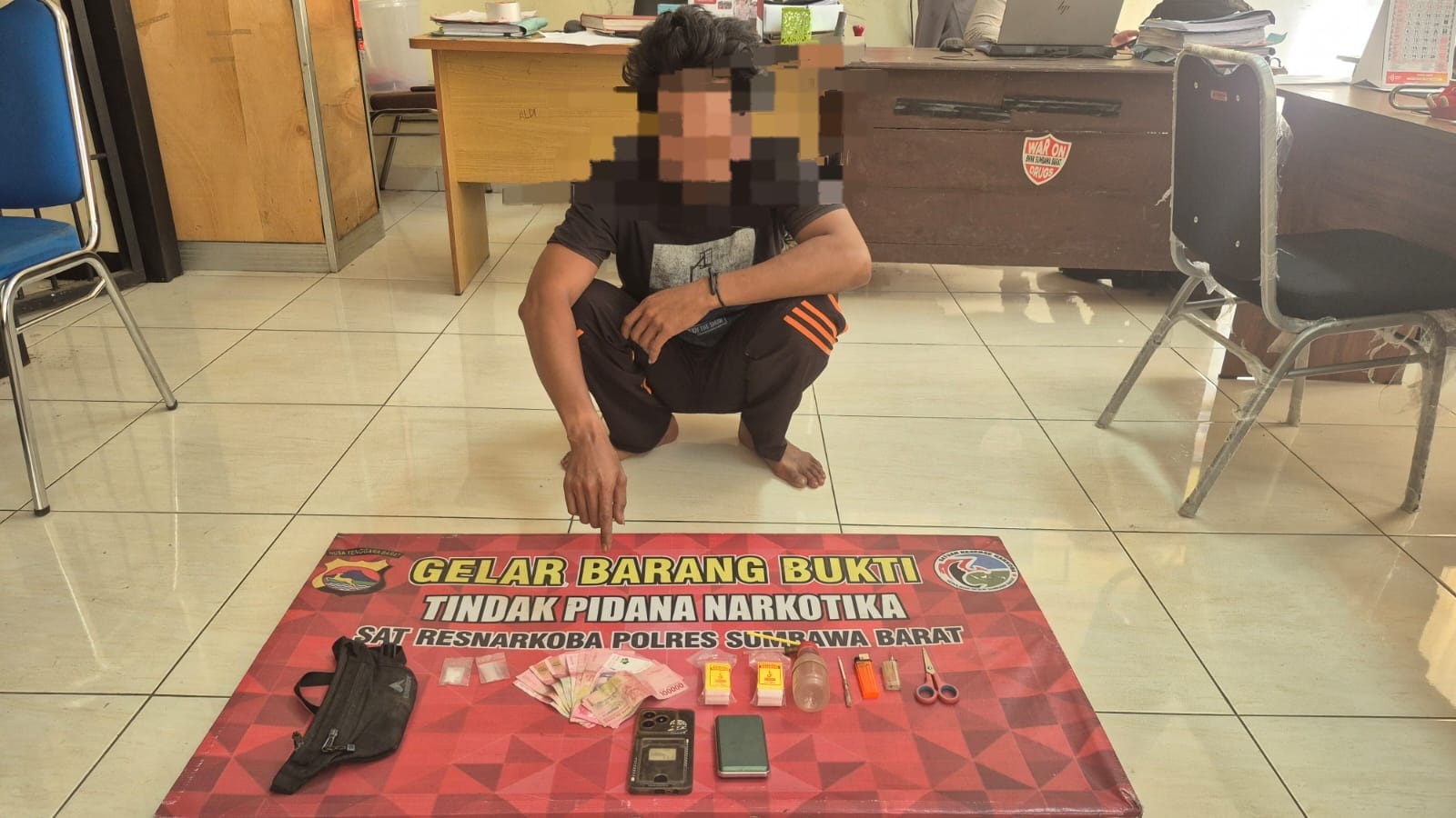 Penangkapan dilakukan di sebuah kamar di Desa Pasir Putih, Kecamatan Maluk, Kabupaten Sumbawa Barat. Dari tangan terduga pelaku, polisi berhasil mengamankan sejumlah barang bukti, di antaranya 1 (satu) buah tas selempang, 1 (satu) lembar plastik klip berisi plastik-plastik klip kecil yang berisi sabu, 1 (satu) perangkat alat hisap sabu (bong), 1 (satu) unit handphone Android, 1 (satu) buah timbangan digital, dan uang tunai sebesar Rp900.000,- yang diduga merupakan hasil penjualan sabu.