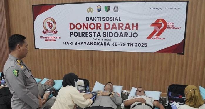 Jakarta. Dalam rangka menyambut Hari Bhayangkara ke-79, Polresta Sidoarjo menggelar kegiatan bakti sosial donor darah. Ada ratusan peserta dari berbagai elemen masyarakat yang turut serta dalam bakti sosial ini.