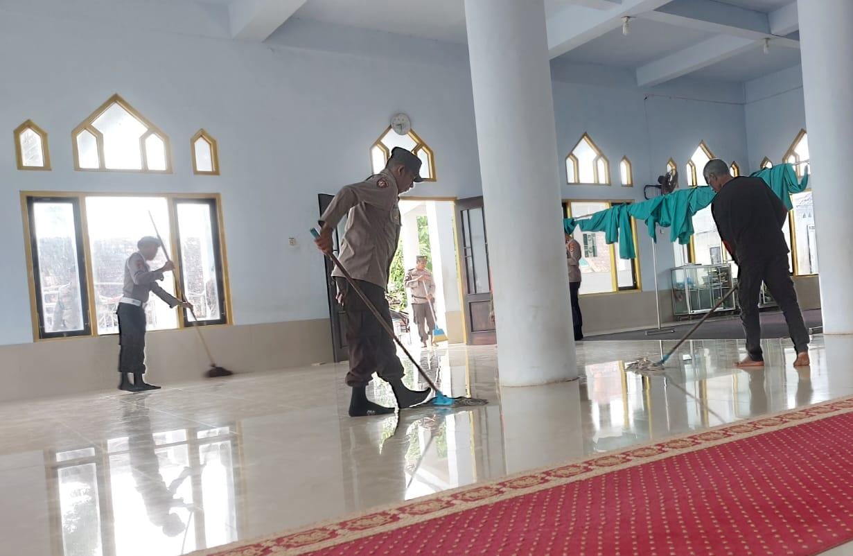 Gotong royong yang dimulai sekira pukul 09.00.Wita itu anggota Polsek Bolo bersama warga sekitar membersihkan seluruh bagian Masjid mulai dari halaman depan hingga bagian dalam.