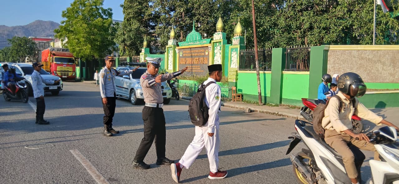 Anggota Lantas Polsek Rasanae Barat Polres Bima Kota Laksanakan Strong Point di Depan MTsN 1 Kota Bima