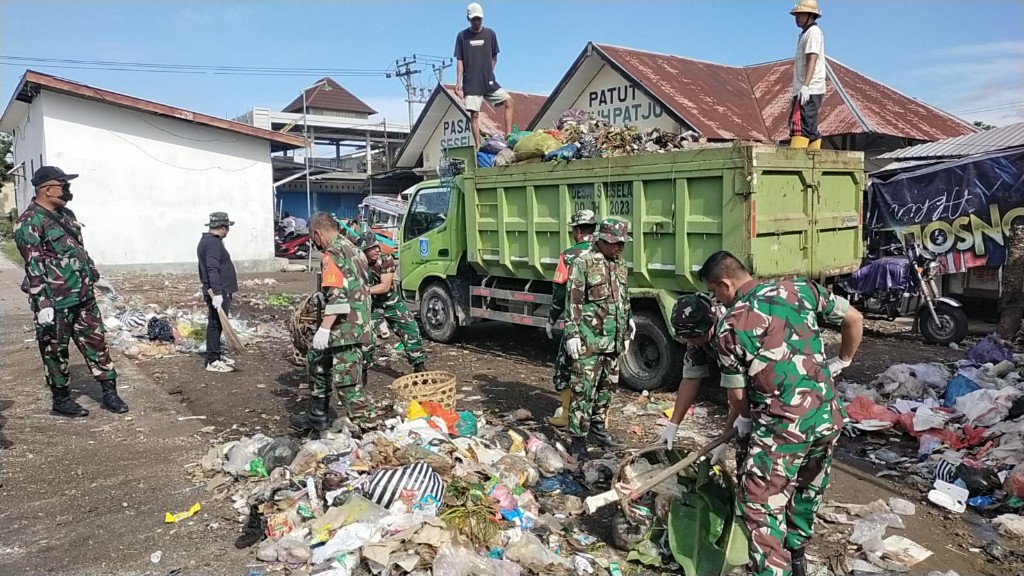 Babinsa dan Warga Sesela Bersihkan TPS Pasar