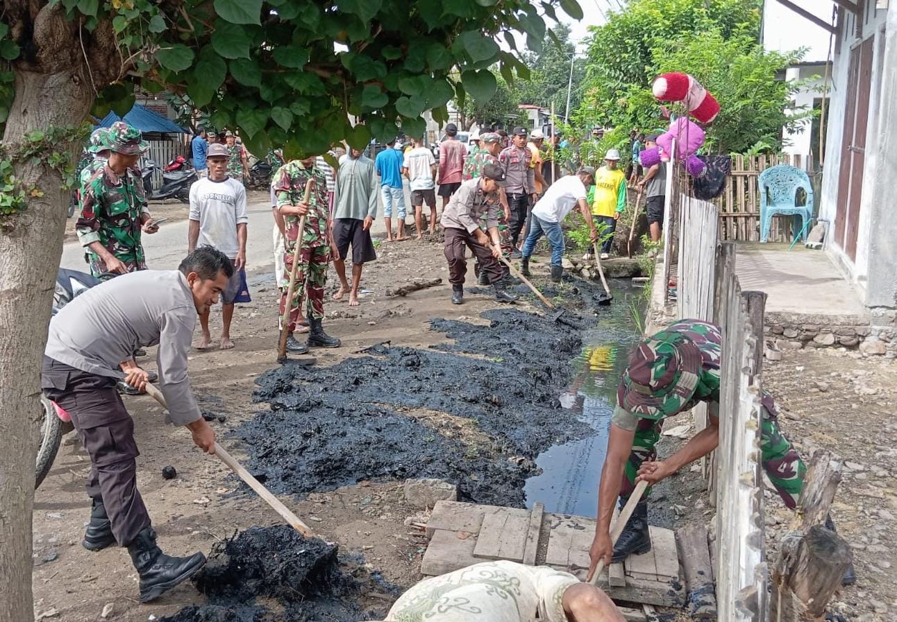 Personel TNI, Polri, Pemdes dan masyarakat bergandengan tangan menciptakan lingkungan yang bersih dan sehat. Kegiatan ini menjadi simbol persatuan sekaligus bukti nyata kebersamaan aparat dan rakyat.